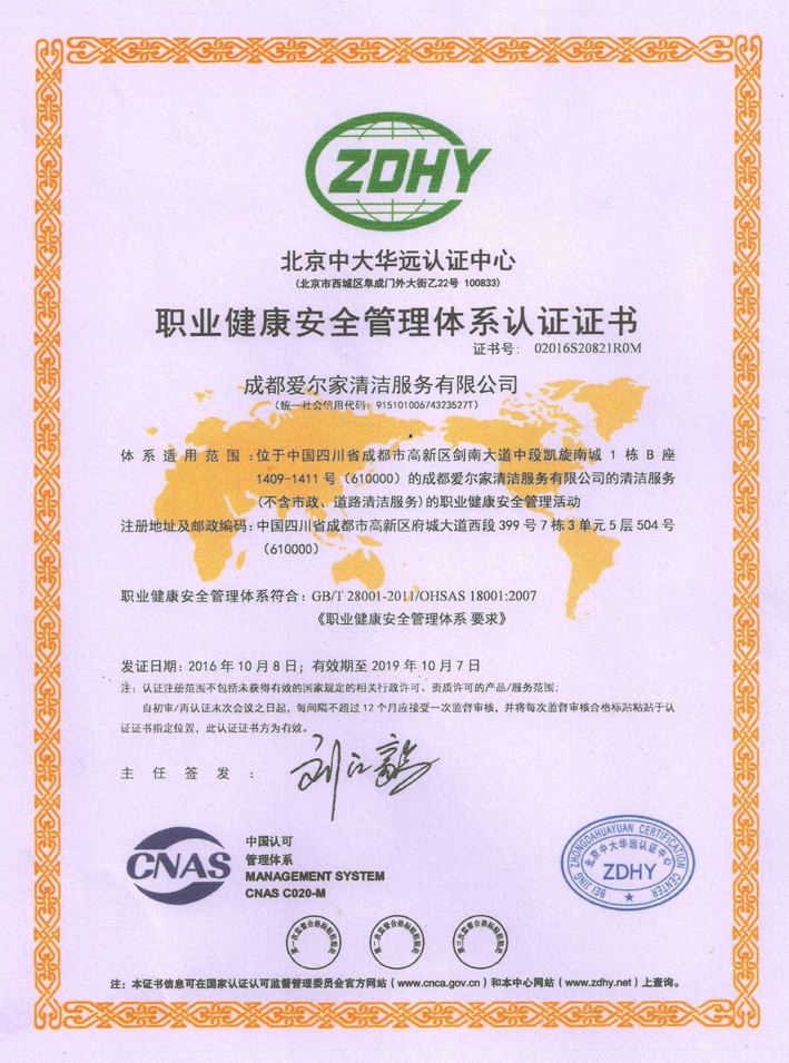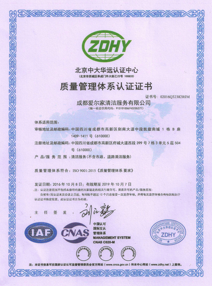 2016年10月爱尔家正式引入质量体系三标认证 标志着爱尔家专业化提升道路上的里程碑